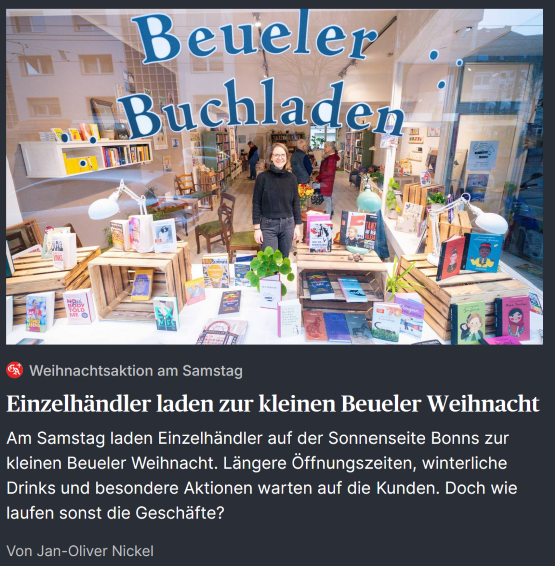 28.11.2025 | Morgen findet die Beueler Weihnacht statt. Und wir freuen uns sehr, dass der General Anzeiger den Beueler Buchladen als Bild für den Artikel ausgewählt hat.
