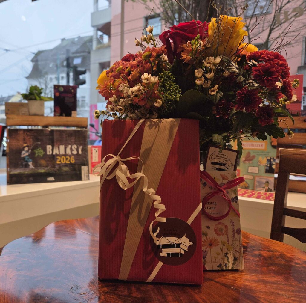 26.11.2025 | Heute hat ein Kunde seiner Frau einen Besuch bei uns im Beueler Buchladen geschenkt. Die Blumen hat er vorab vorbei gebracht und auch das zu verschenkende Buch schon ausgesucht. Dazu gab’s Kaffee.