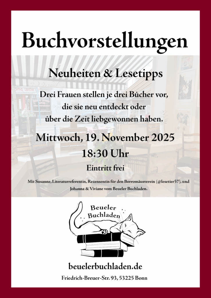 Bei uns im Beueler Buchladen finden verschiedene Veranstaltungsformate statt: Silent Reading-Abende, Buchvorstellungen oder Lesungen. Auch wenn wir bei anderen Veranstaltungen einen Büchertisch betreuen, verweisen wir hier darauf.