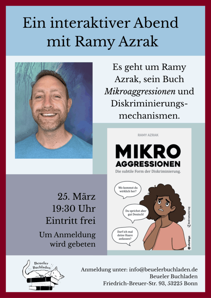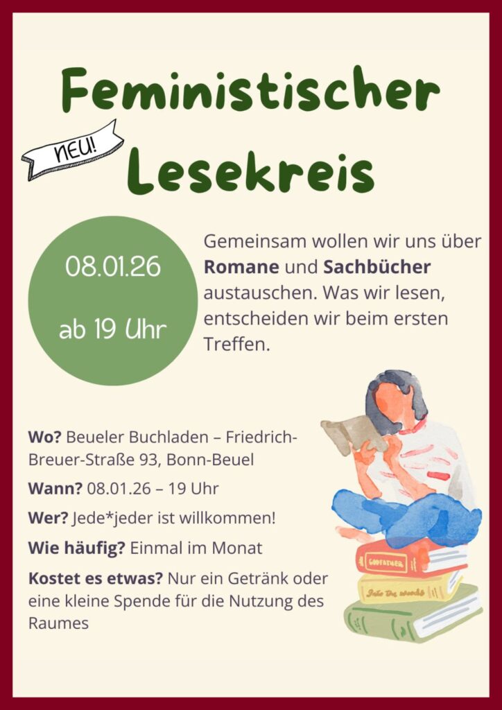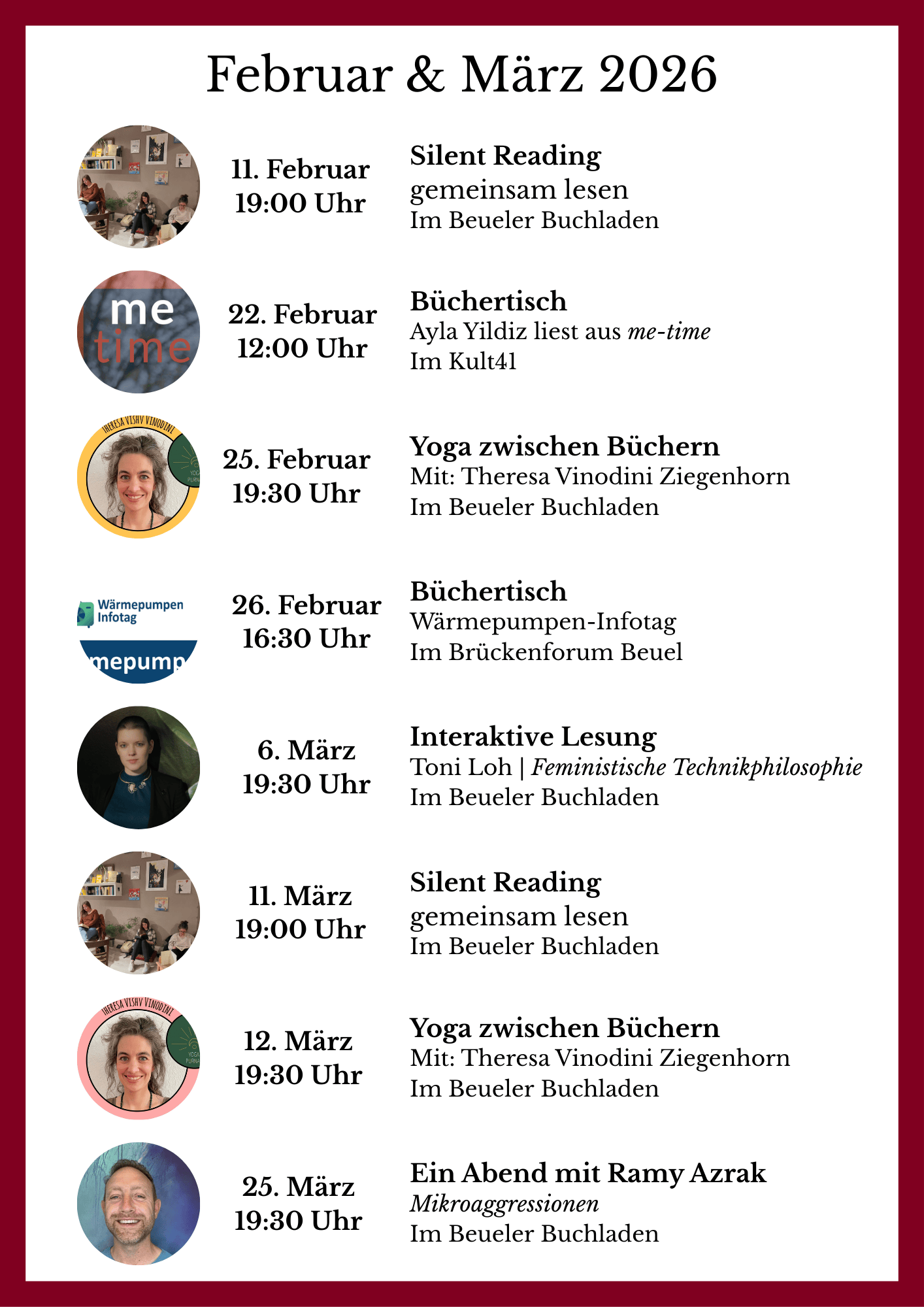Bei uns im Beueler Buchladen finden verschiedene Veranstaltungsformate etwa Silent Reading-Abende, Buchvorstellungen oder Lesungen statt. Auch wenn wir bei anderen Veranstaltungen einen Büchertisch betreuen, verweisen wir hier darauf.