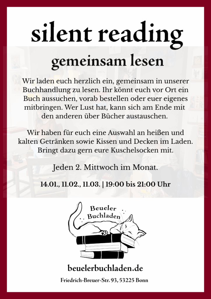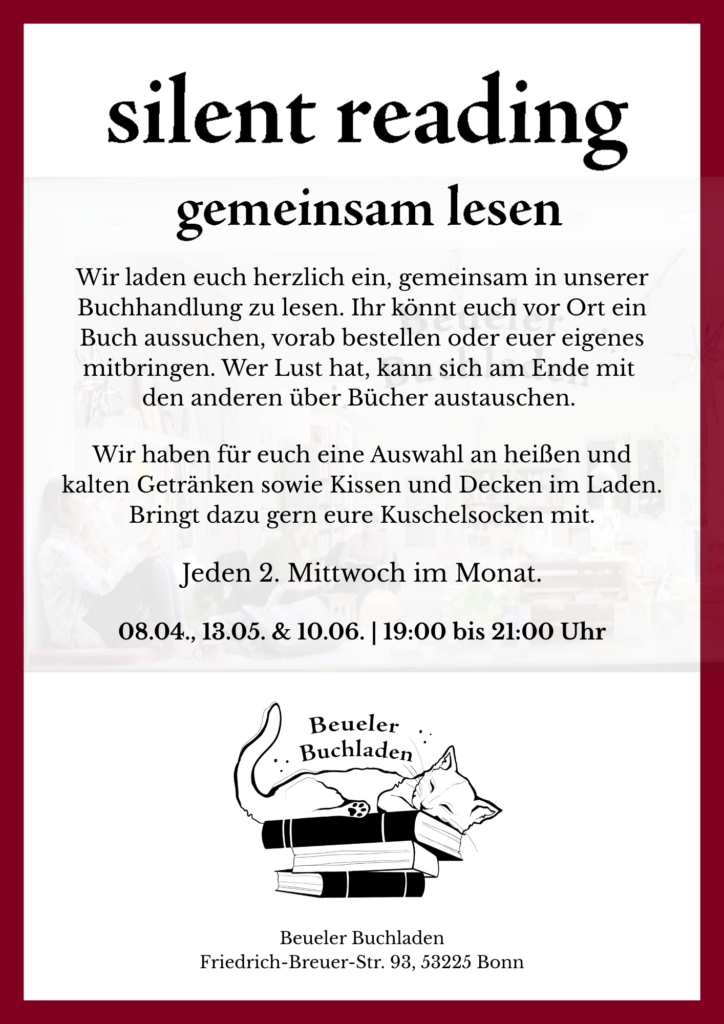 Wir laden euch herzlich ein, gemeinsam im Buchladen zu lesen. Bringt entweder euer eigenes Buch mit oder sucht euch vor Ort euer Buch für den Abend aus. Wer sicher gehen will, dass wir das passende Buch dahaben, kann vorher gerne über info@beuelerbuchladen.de nachfragen.