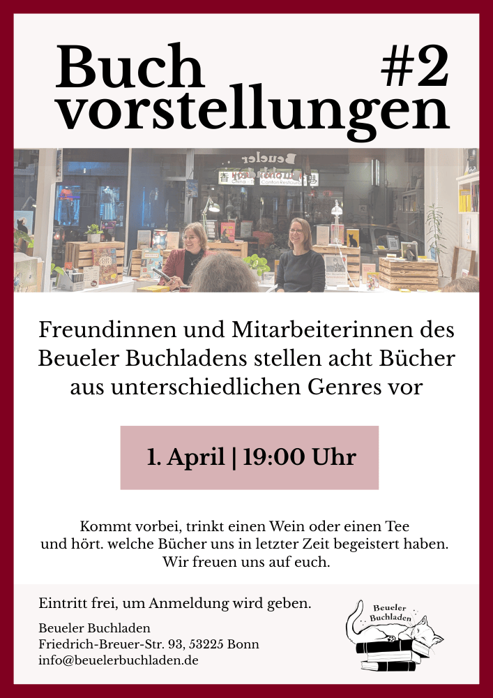 Nach unserer ersten Buchvorstellung im November letzten Jahres möchten wir zur zweiten Ausgabe einladen. Dieses Mal werden Vivian (von vivis.bücherlei), Susanne (lesetier57) sowie Johanna und Viviane vom Beueler Buchladen je zwei Bücher vorstellen.